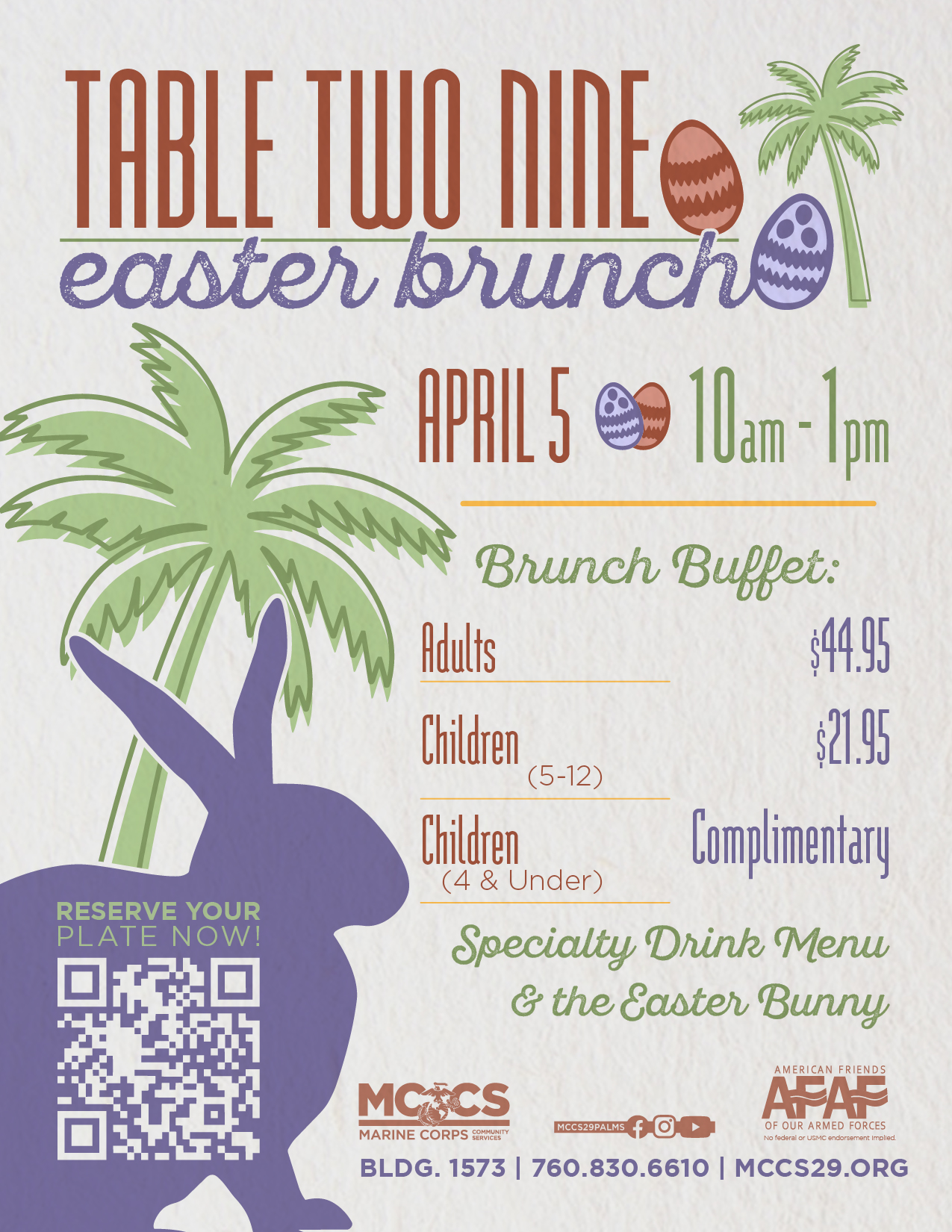 Phone: (760) 830-6610Hop over to Table Two Nine to enjoy a delicious brunch, specialty drink menu and meet the Easter Bunny